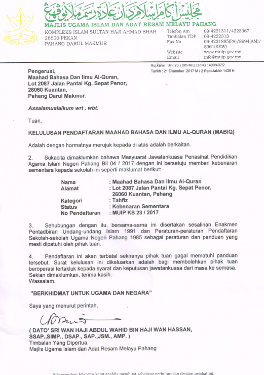 MABIQ (Maahad Bahasa dan Ilmu Al-Quran) ditubuhkan pada 3 Januari 2007 sebagai sebuah maahad tahfiz Al-Quran, akademik dan kemahiran yang berkonsepkan kebajikan kepada anak-anak yatim dan fakir miskin. Berlokasi di Lot 29738, Kampung Peramu, Tanjung Lumpur Kuantan, Pahang, MABIQ memulakan pengajian Al-Quran dan bahasa dengan bilangan pelajar seramai 20 orang sahaja.